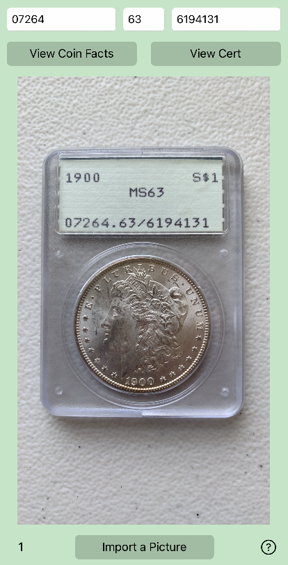 The screenshot on the right shows the Rattler Scanner app's main view. Live video can be used to scan a slab's number and populate the upper text fields. Clicking on either button will launch the PCGS apps or websites if the apps are not installed to look up the coin. Alternatively, you can import a photo to read the number. Multiple numbers can be read at once and the user can pan and zoom the image to isolate a specific slab. The 1 in the lower left is the number of coin numbers currently identified.